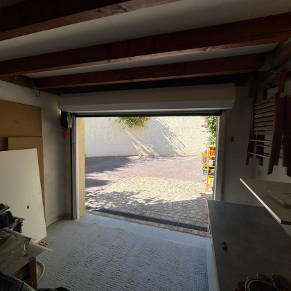 Nous vous présentons cette rénovation de garage réalisée par Techni Confort à Sainte-Maxime (83). Le client souhaitait remplacer son ancienne porte de garage par une solution moderne et motorisée, synonyme de confort et de gain de place. Nous avons installé une porte de garage enroulable de la marque Hormann, entièrement motorisée. Ce type de porte est idéal pour les garages où l'espace au plafond doit être conservé. Le chantier a nécessité quelques ajustements techniques réalisés par nos équipes, notamment la découpe d'une poutre pour permettre l'installation optimale du système d'enroulement. La pose a été effectuée en applique et nos techniciens ont assuré le passage des câbles pour se raccorder à une ligne électrique existante, garantissant une intégration discrète. La composition en acier de la porte assure une meilleure isolation du garage, contribuant au confort thermique global de la maison.