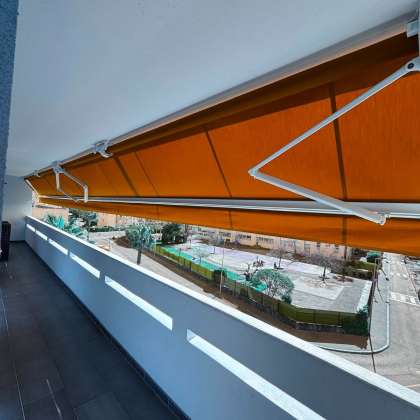 Afin de respecter la charte de la copropriété, la toile a été choisie dans le coloris RAL0017, garantissant une intégration parfaite à la façade du bâtiment.
